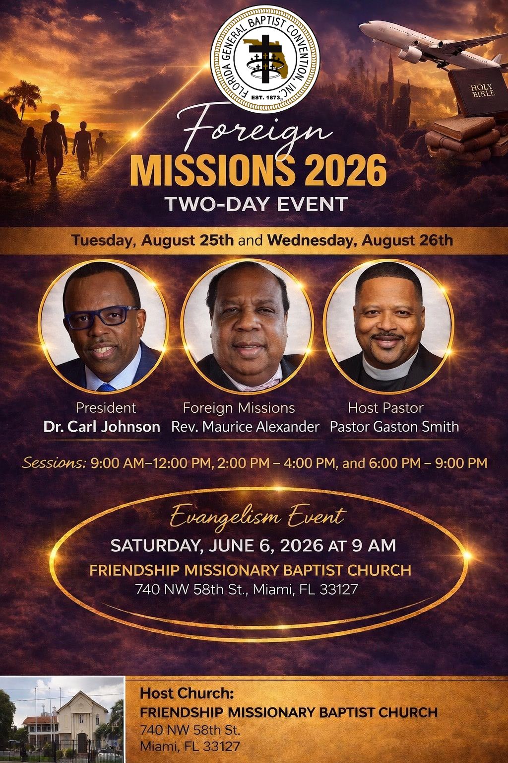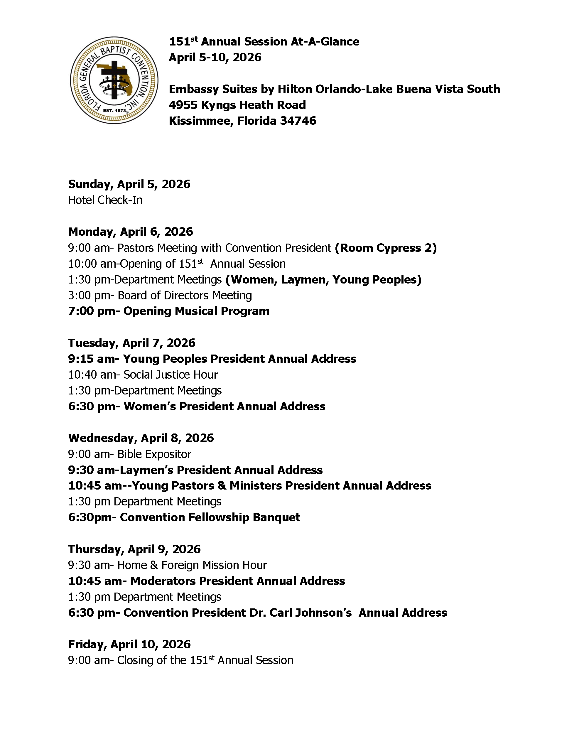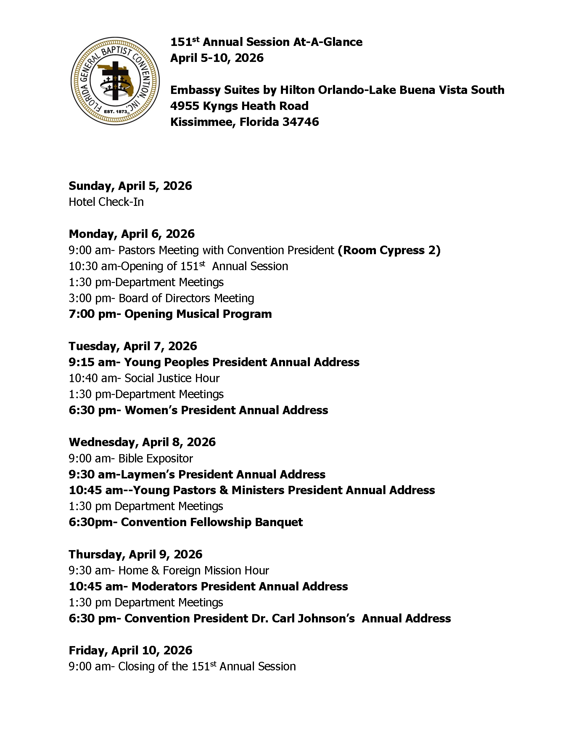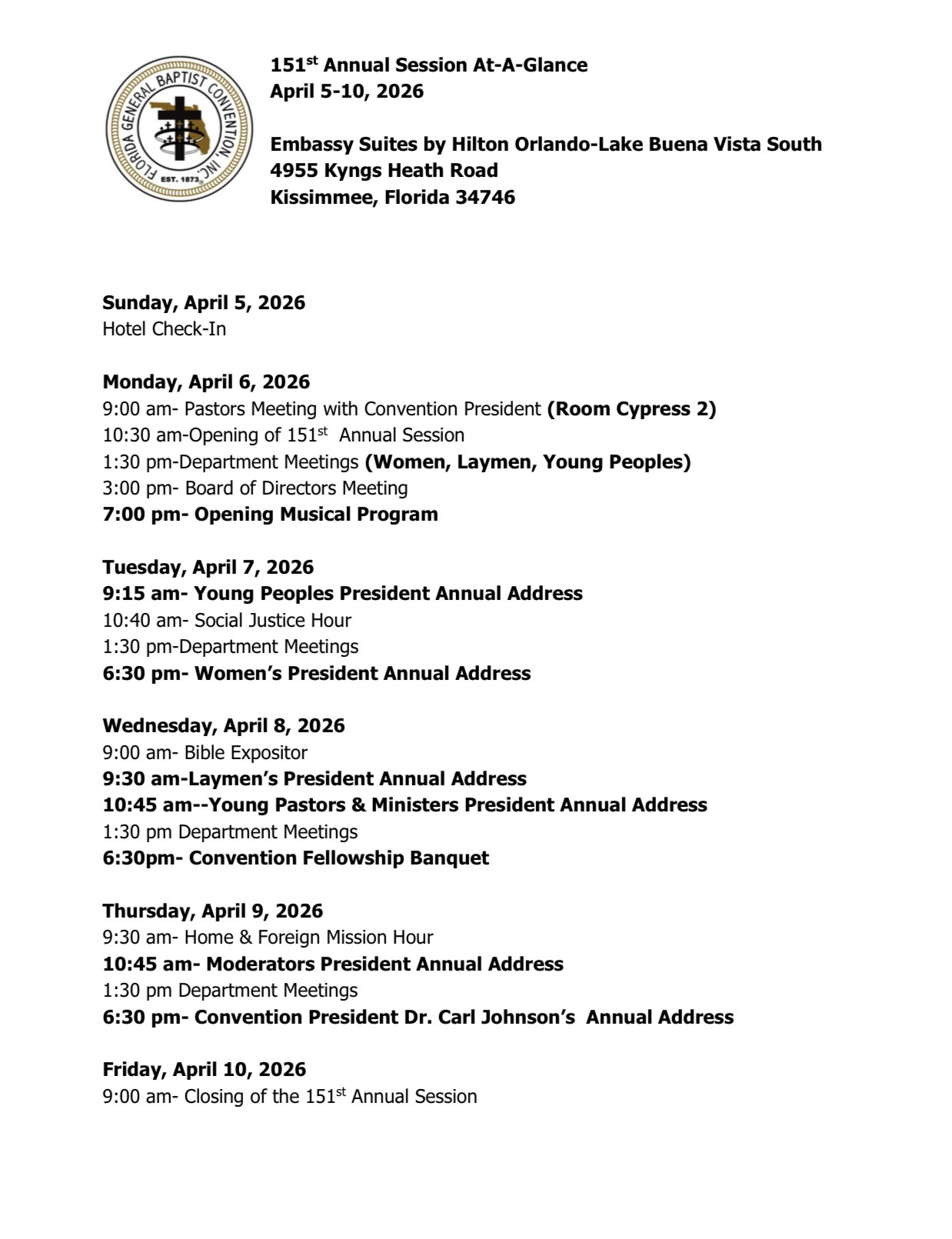 Our President, Dr. Carl Johnson, is asking for all pastors to meet with him on Monday, April 6, 2026 at 9 AM. The meeting will take place at the Embassy Suites Hotel located at 4955 Kyngs Heath Road, Orlando, Florida 34746. The room will take place in Cypress 2.